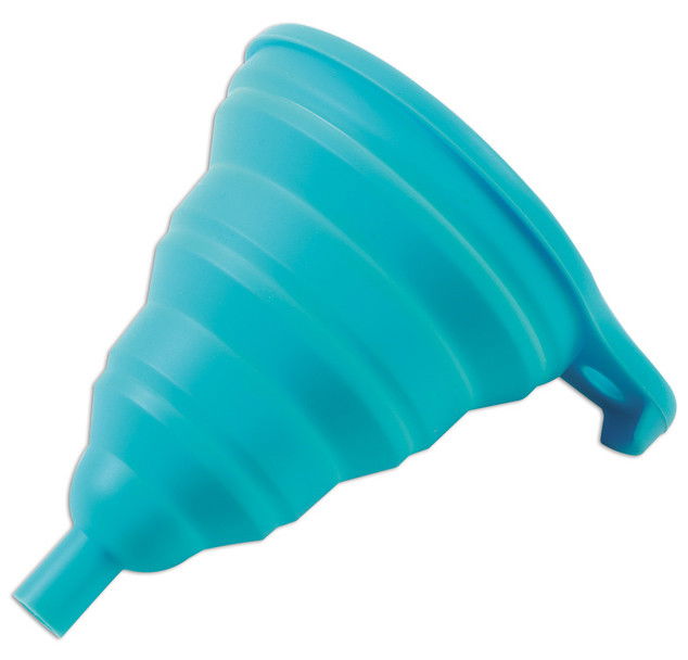 Praktikus, összehajtható (összecsukható) 10 cm-es tölcsér, speciális rugalmas szilikon anyagból.